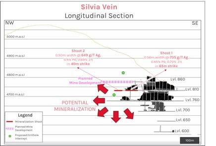 Silvia Vein - Shoot 2: 649 g/t Ag, 0.40% Pb and 0.69% Zn over 0.50 metres across 40 metres of strike (Figure 01).