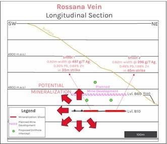 Rossana Vein: Two additional mineralized shoots identified, including 497 g/t Ag (over 0.92m width in Shoot 1) and a zinc-rich shoot grading 1.98% Zn (Shoot 2) in Figure 02.