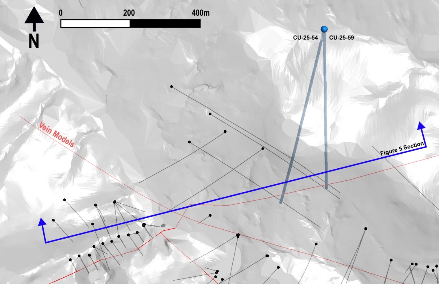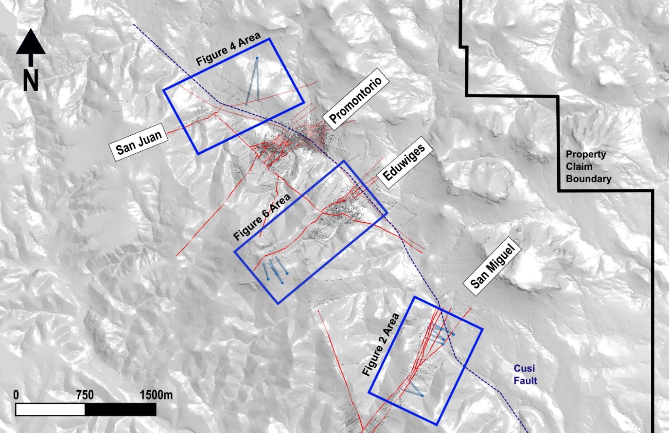 The Company also tested the western extension of the Eduwiges veins, hitting 1.1 metres of 937 g/t AgEq and 1.1 metres of 437 g/t AgEq in two separate veins in hole CU-25-50a. These intercepts are approximately 300 meters from the existing underground drifts at Eduwiges. The western extents of the Eduwiges, Promontorio, and San Juan vein systems have seen limited drilling. However, recently flown LiDAR combined with field mapping has outlined old historical workings continue to the west for upwards of 1,000 metres.