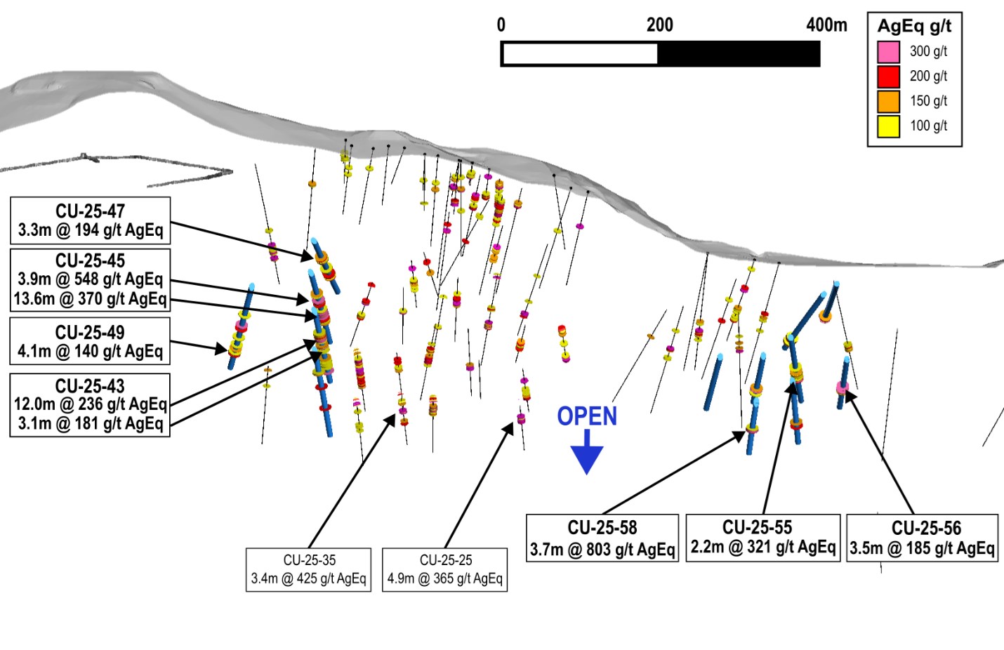 Drilling to the east at San Miguel, at the intersection of the Cusi Fault, returned 3.7 metres grading 803 g/t AgEq in CU-25-58. Additional results included 2.2 metres grading 321 g/t AgEq in CU-25-55 and 3.5 metres grading 185 g/t AgEq in hole CU-25-56. Drilling on the eastern extent has only been completed to a depth of approximately 200 metres, whereas the western portion has intercepted the vein at depths exceeding 350 metres from surface and remains open.