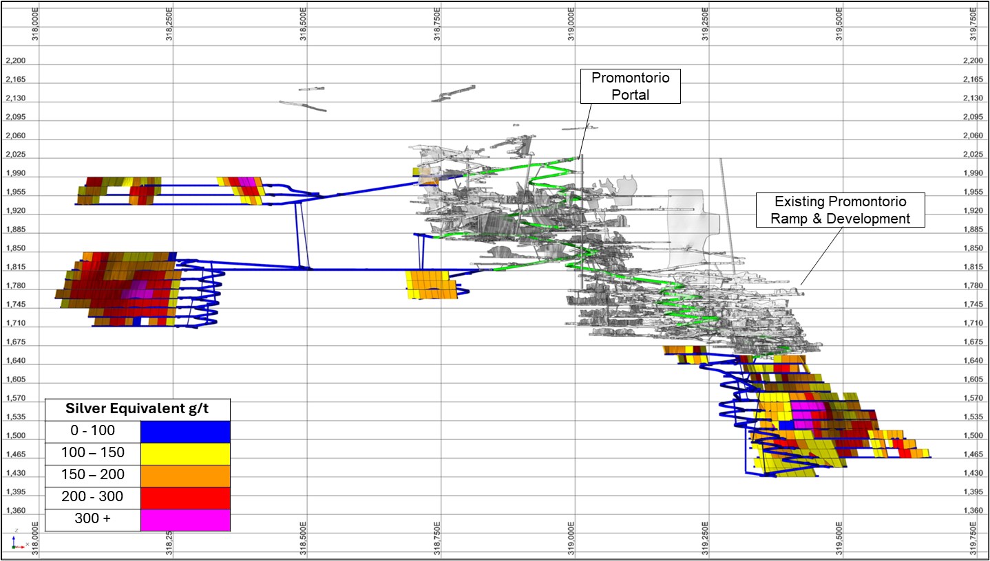 Figure 6 - Promontorio and San Juan Mine Design - Long Section View, Looking North