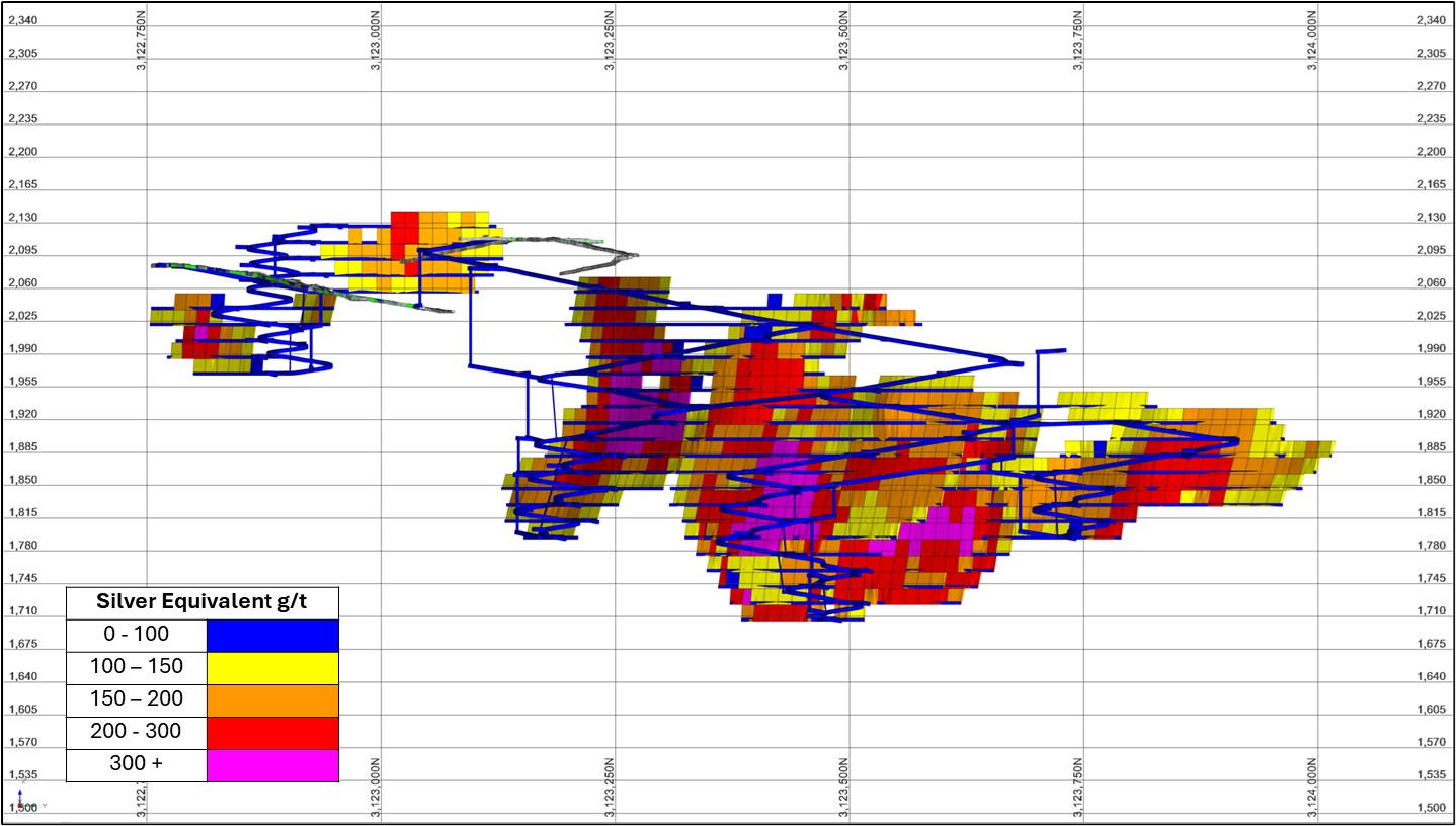 - The underground base case cut-off grade of 120 g/t AgEq considers metal prices of US$30/oz Ag, US$2400/oz Au, US$1.00/lb Pb, and US$1.35/lb Zn and metal recoveries of 90% for Ag, 50% for Au, 90% for Pb, and 60% for Zn.