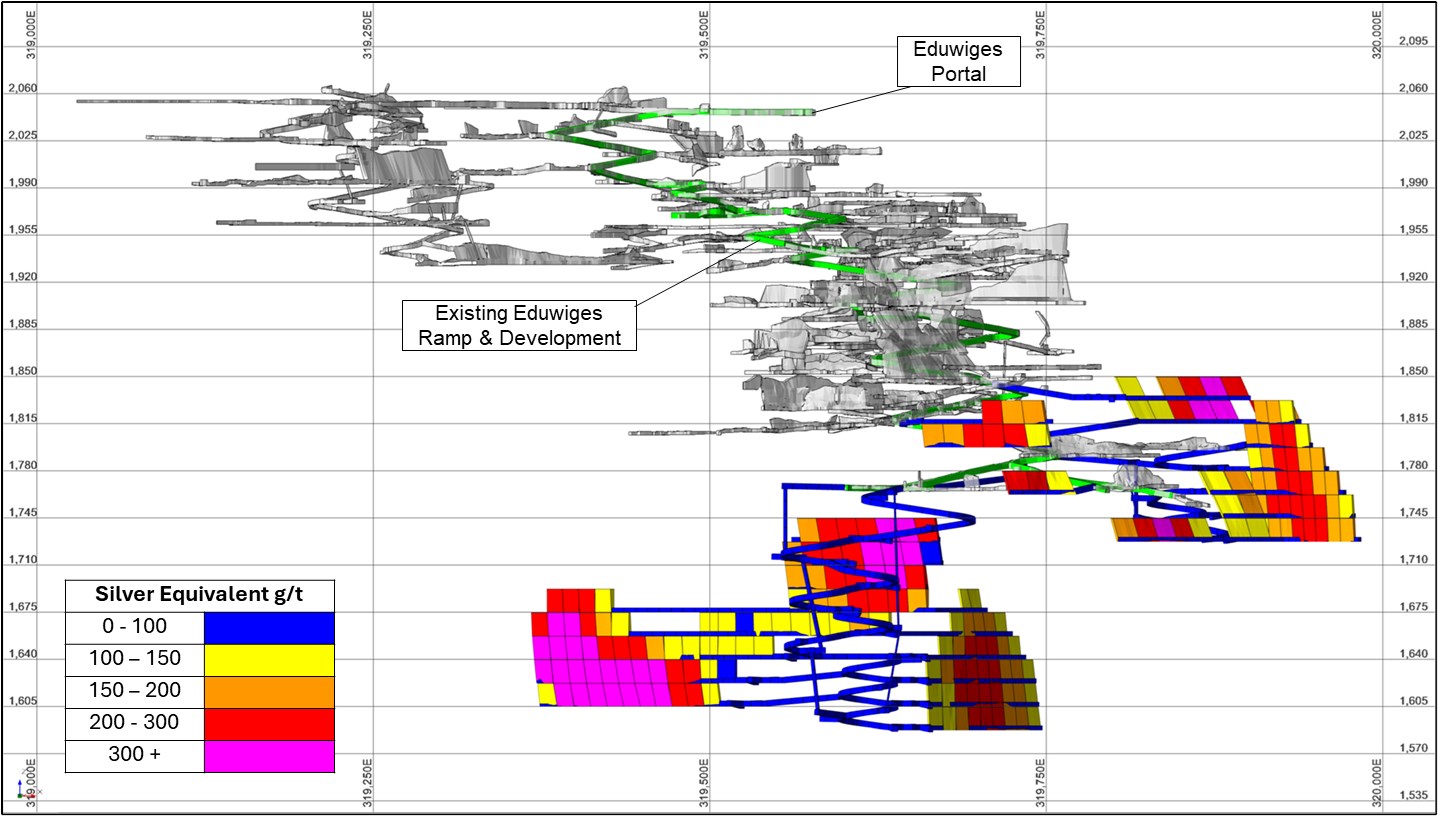 The PEA envisions a multi-front mining operation focused on three primary mineralized zones: Promontorio, San Miguel, and Eduwiges. These zones consist of multiple vein structures, providing the operation with significant operational flexibility through a variety of active working fronts. To ensure operational redundancy and a consistent mill feed, each zone is accessible via its own independent ramp and portal system, ensuring operational redundancy. Underground development and production mining will be executed by mining contractors, allowing the Company to leverage external expertise and equipment to optimize the restart.