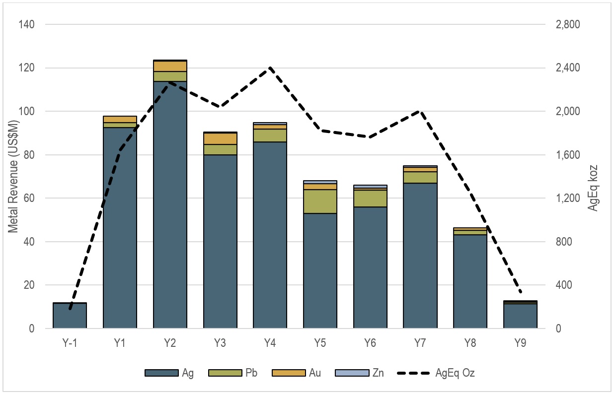 Average annual production of ~2.5 Moz silver equivalent ("AgEq")1Â (2028-2033) with ~90% revenue from silver.