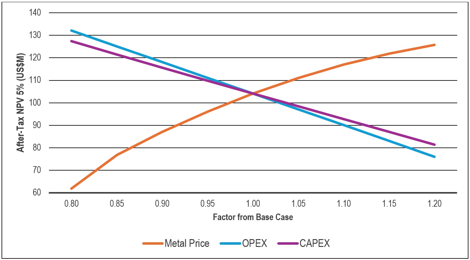 The project economics are most sensitive to metal prices, followed by operating costs and capital expenditure. The table below shows the after-tax NPV(5%) at varying multipliers applied to each parameter.