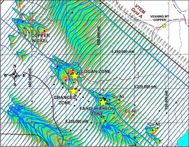 Goodwin VTEM Survey: The Company also reports that Geotech has completed the 850 km VTEM survey over the Goodwin copper-nickel cobalt project. The Company has received preliminary maps such as the VTEM profile map shown below on Figure 1. VTEM conductors are associated with the Granges, Logan and Farquharson zones where the Company has drilled 25 holes that include a 64.90 meter core interval, grading 2.19% Cu-Eq (copper-nickel-cobalt), including 3.84% Cu-Eq over a 31.20 meter core interval from hole GW24-02 as reported in a news release August 7, 2024. Significant gold values were also reported from the Granges zone with up to 3.31 grams per tonne over 0.5m in hole GW24-01.