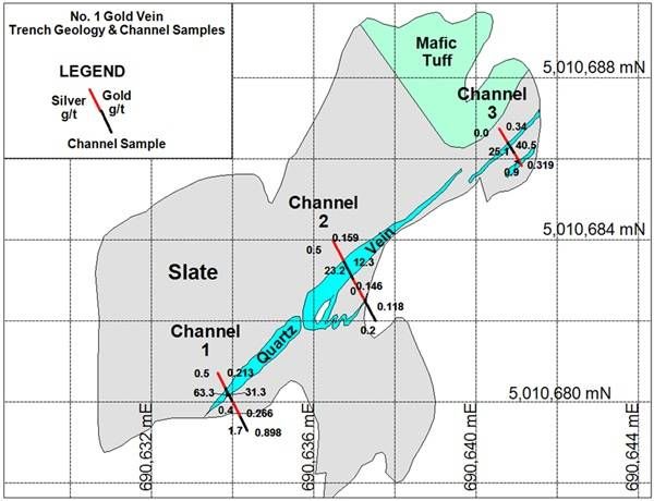 The Company has plotted the results of channel samples cut across the No. 1 vein. Eleven samples each 0.40 meters in length were cut in 3 channels that cross the vein and extend into the wall rock on both sides. Assays of the vein are 31.3 g/t gold, 12.3 g/t gold and 40.5 g/t gold plotted on the right side of the channel along with 63.30 g/t silver, 23.2 g/t silver and 25.1 g/t silver plotted on the left side of each channel as shown on Figure 2.