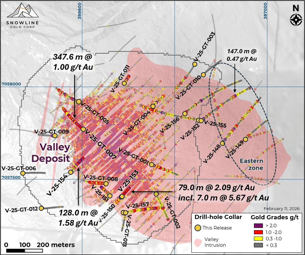 "We continue to see consistent gold from surface at Valley along with an expanding mineralized footprint to the system," said Scott Berdahl, CEO & Director of Snowline. "Results from infill and geotechnical drilling are expected to inform reclassification of high value, near-surface mineralization for inclusion in our ongoing Prefeasibility Study. Results from exploration holes drilled in the eastern part of the Valley intrusion add significant scale while highlighting the potential for additional high‑grade centres in untested parts of the intrusion. Beyond Valley, regional drilling and the new discovery of mineralization at Crossroad on the Cynthia Project increase the opportunities within our regional exploration pipeline. As we advance Valley through prefeasibility and towards permitting, we aim to build on our exploration progress by confirming multiple mineralized centres in a new Canadian gold district."