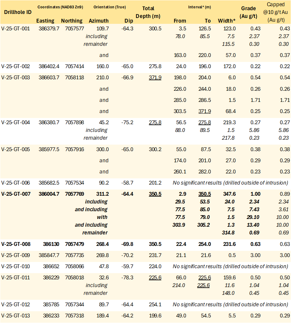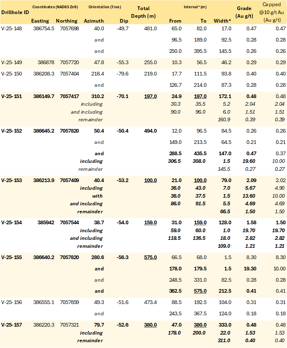 Geotechnical and Condemnation Drilling: The 2025 geotechnical program at Valley successfully collected data that support mine planning scenarios under evaluation while increasing confidence for future resource estimation. Analytical results for gold are presented in Table 3. Notably, geotechnical hole V-25-GT-007 returned 1.00 g/t Au over its entire 347.6 m length from bedrock surface, ending near a prospective, open zone of mineralization on the northwestern edge of the Valley deposit.