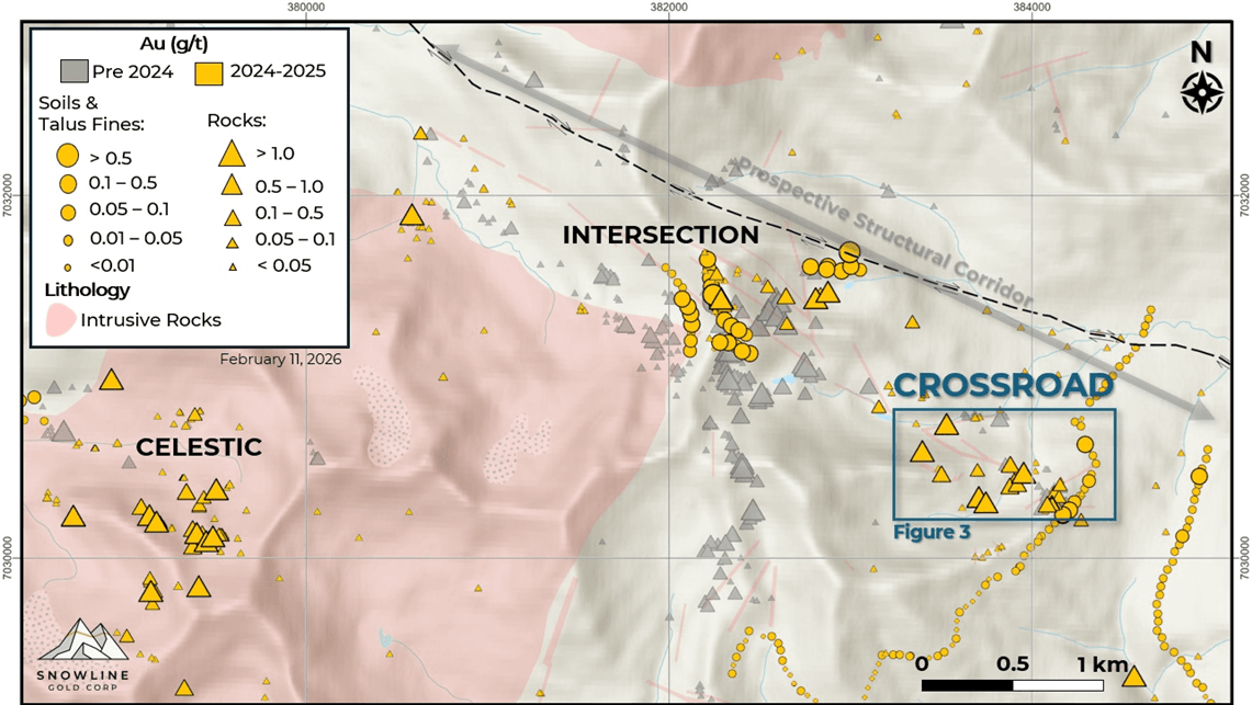 Crossroad Target: Reconnaissance prospecting, soil sampling and mapping on the Cynthia Project led to the discovery of a new mineralized zone named the Crossroad target, located roughly 27 km south of Valley and 10 km from the Plata Winter Trail (Figures 2 and 4). Gold mineralization has been encountered in surface samples from an area of 1,000 x 300 m, with selective grab samples returning up to 14.1 g/t Au and 3,505 g/t Ag (including elevated Bi, Cu, Fe, Pb, Sn, Te & Zn values), along with a chip sample across a 7.0 m outcrop which returned 0.6 g/t Au. Mineralization is hosted within altered siltstones and argillites as well as hydrothermal breccia units and granodioritic dykes. The Crossroad target is located along the same structural corridor as Snowline's "Intersection" target, also on the Cynthia Project, along a prospective five-kilometer trend with multiple outcrops showing reduced intrusion-related mineralization. The Company will continue surface evaluation of Crossroads and the broader corridor in 2026 to define potential drill targets.