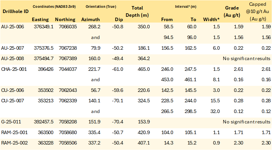 Table 2 - Anomalous gold intervals in drillholes V-25-148 through V-25-157 from the Valley deposit. Underlined numbers indicate end-of-hole values within mineralized intervals. Holes V-25-148, 149, 152 & 156 are from the new zone of mineralization on the eastern side of the Valley intrusion. *Interval widths shown.