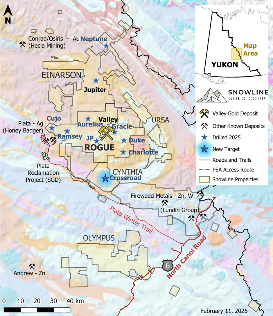 VANCOUVER, BC / ACCESS Newswire / February 11, 2026 / Snowline Gold Corp. (TSX:SGD)(OTCQB:SNWGF) (the "Company" or "Snowline") is pleased to report additional analytical results from its 2025 exploration program, including exploratory, infill, geotechnical and condemnation drilling for its Valley deposit ("Valley") on its flagship Rogue Project in the eastern Yukon Territory. Results highlight ongoing resource de-risking through successful infill drilling of higher grade, near-surface mineralization and outline an extensive zone of lower grade mineralization outside of the current resource. Open edges of the system point to untested, prospective areas with the host intrusion for future drill testing. The Company also reports results from five regional drill targets on its Rogue Project and the discovery of a new mineralized target - Crossroads - on its Cynthia Project, where selective grab sampling returned values up to 14.1 g/t Au and 3,505 g/t Ag. Regional drilling and surface results are being used to guide targeting for Snowline's upcoming 2026 exploration program.