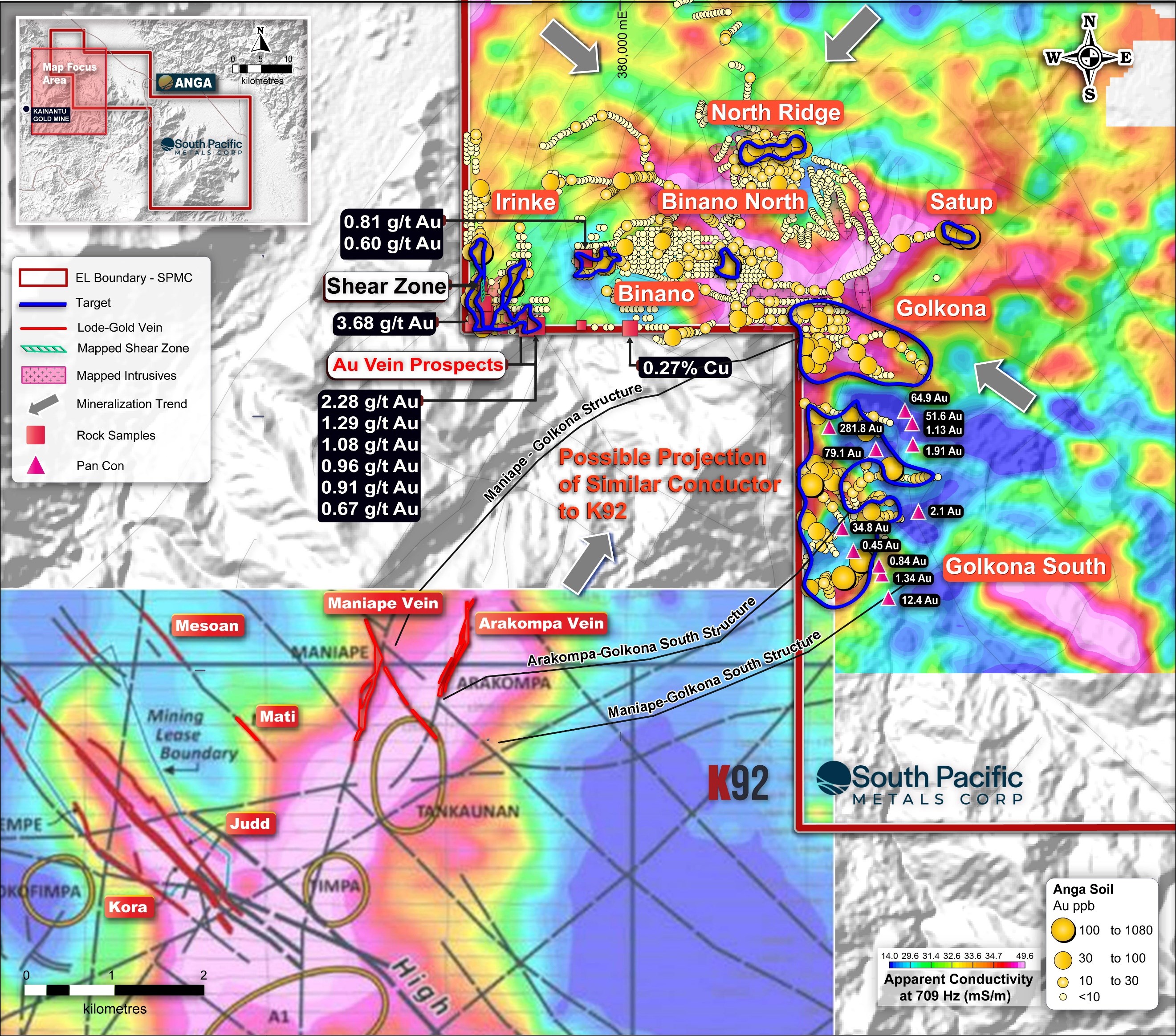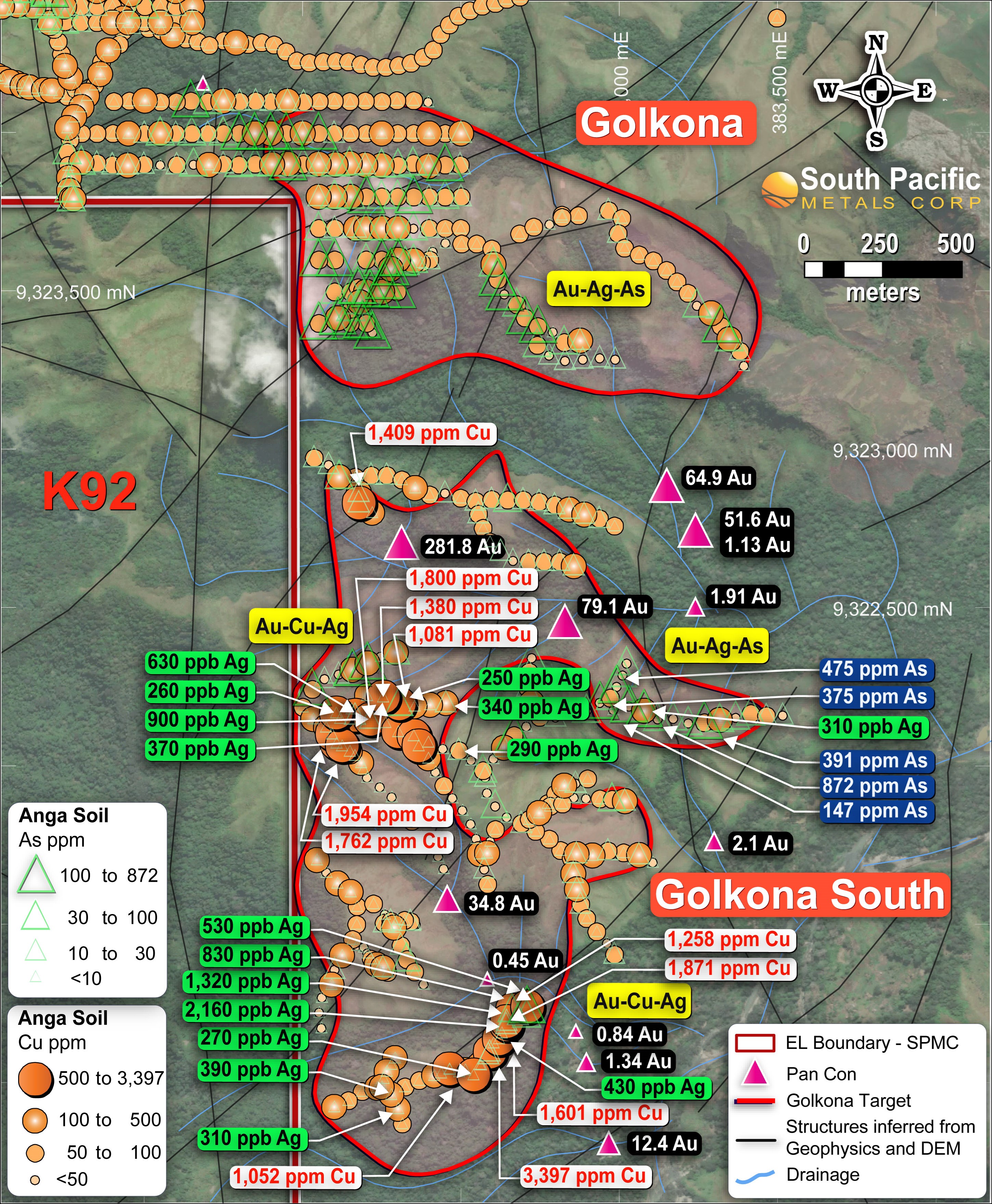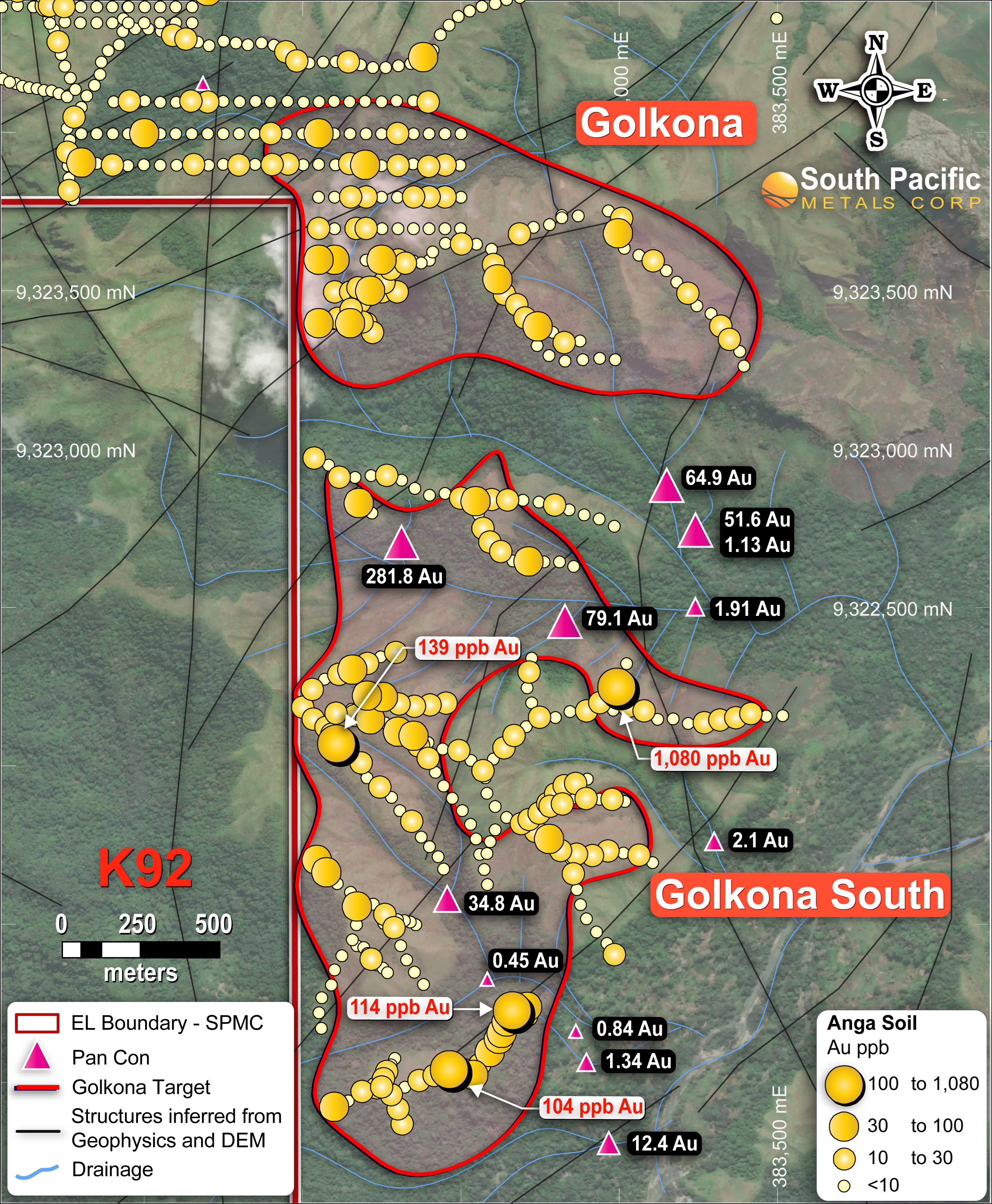 "We are very pleased with these latest soil geochemical results at Golkona South," said Timo Jauristo, CEO of South Pacific Metals Corp. "The potential of Golkona South and the Anga tenements are highlighted by these results and their location along the northeasterly trend from K92's large and growing Arakompa project. We look forward to continuing to advance this project, although our immediate priority is the imminent start of drilling to test the exciting epithermal vein targets at Ontenu NE."
