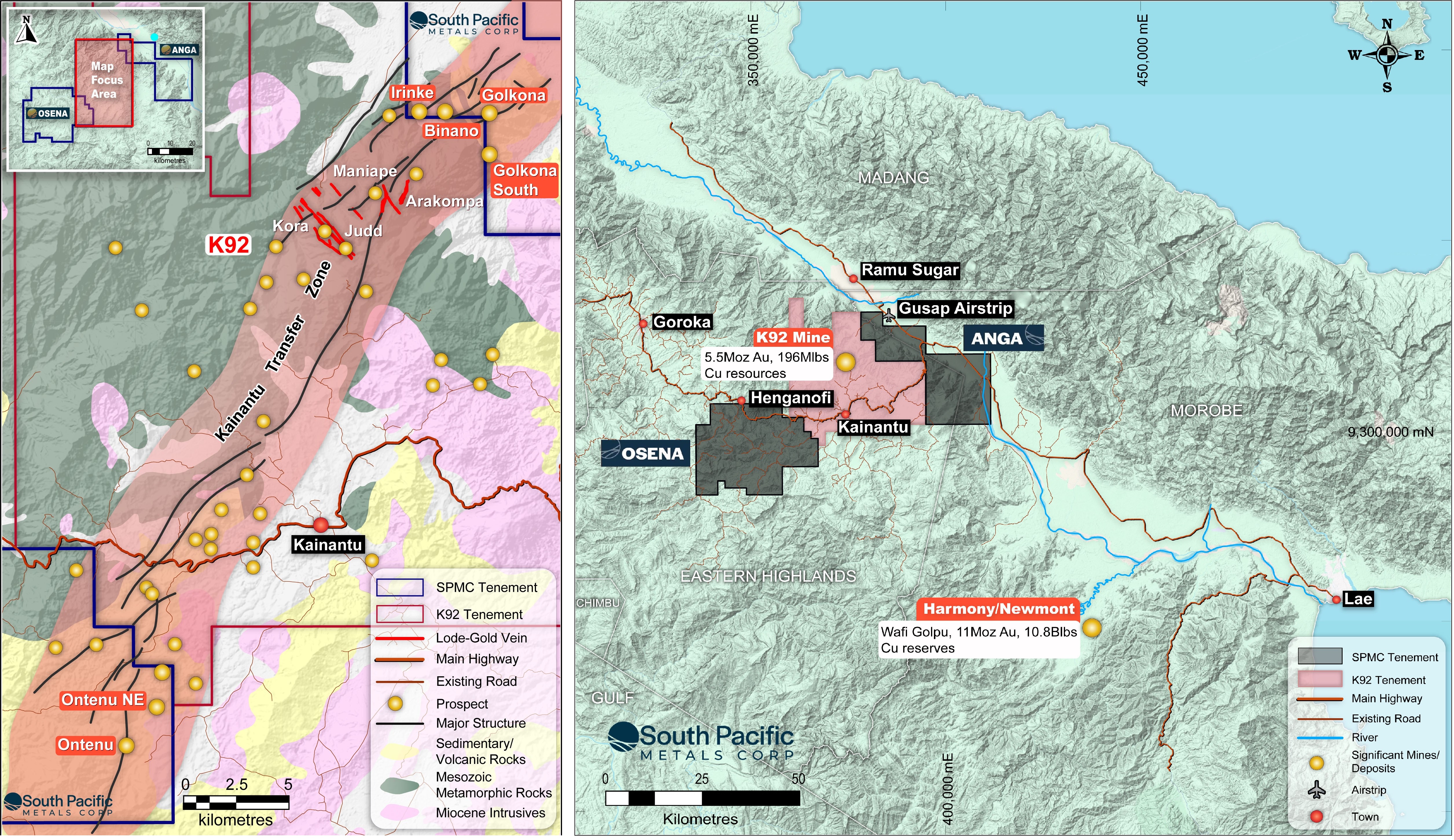 South Pacific Metals Corp. (TSXV: SPMC,OTC:SPMEF) (OTCQB: SPMEF) (FSE: 6J00) ("SPMC" or the "Company is pleased to announce the discovery of a new gold-copper mineralized zones at Golkona South, part of the Company's Anga Project in Papua New Guinea. The Anga Project lies immediately northeast of, and contiguous with, K92 Mining's tenements in the Kainantu District — a highly prospective gold-copper district in PNG.