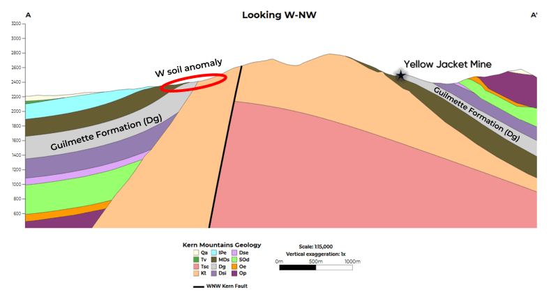 Click Image To View Full SizeFigure 2: A-A' Cross Section at Tungstonia claim block showing the relationship between the Yellow Jacket Tungsten Mine and previously reported tungsten soil anomaly.