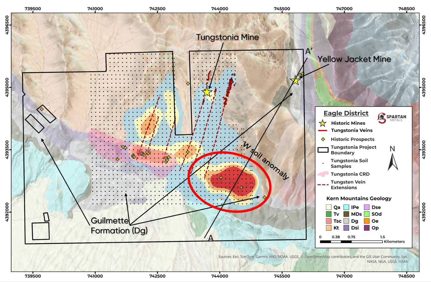 Rebecca Ball, Spartan's VP of Exploration, states, "Acquiring an additional, past producing tungsten mine in the district is an exciting development for Spartan as it allows the team to evaluate and explore both the vein system at Tungstonia and skarn type mineralization potential at Yellow Jacket. Our geologic work continues to expand the footprint of tungsten mineralization at the Eagle Project that commonly exceeds 1.0% WO3. The higher-grade material that was historically produced from the Yellow Jacket Tungsten Mine combined with the known production from our Tungstonia and Rees tungsten mines indicates a significant tungsten endowment in the district, and we are focused on expanding this district-scale exploration project."