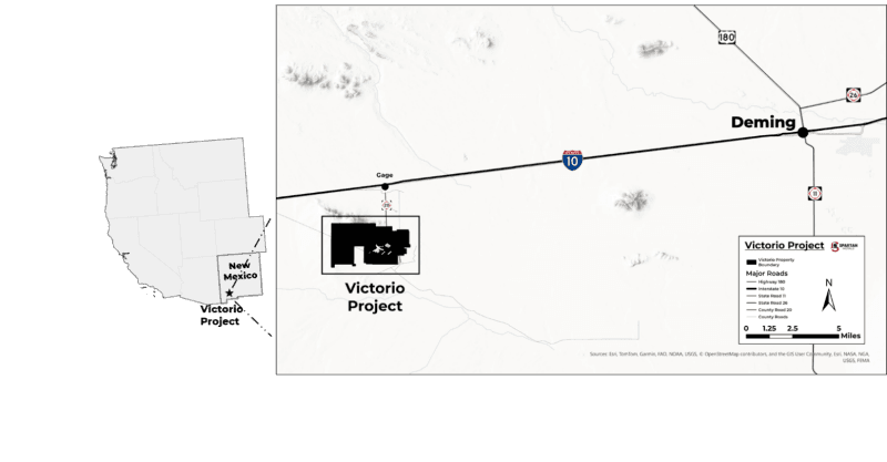 The Project is ~ 15.8 km² in size and located approximately 45 km west of the city of Deming, in the Victorio Mountains of Luna County, New Mexico. The project is 3,909 acres in size consisting of 222 Bureau of Land Management unpatented lode mining claims.