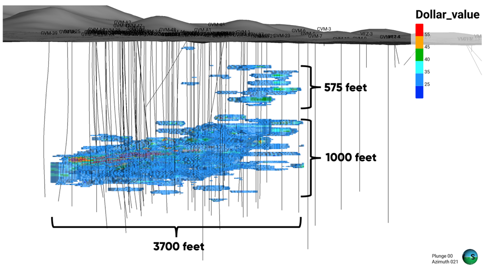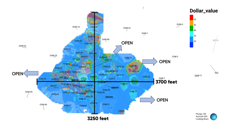 Figure 3: Plan view of historic economic assessment model at US$25/short ton cut off. Note higher dollar value core in west-central portion of the deposit with expansion opportunities toward the north-northeast, east, and west.