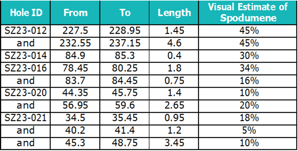 - Drill hole SZ23-021 with 5.60m of spodumene mineralisation from 34.5m downhole