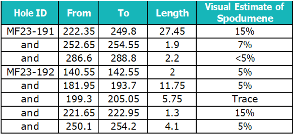 - Drill hole MF23-191 with 27.45m of spodumene mineralisation from 222.35m downhole