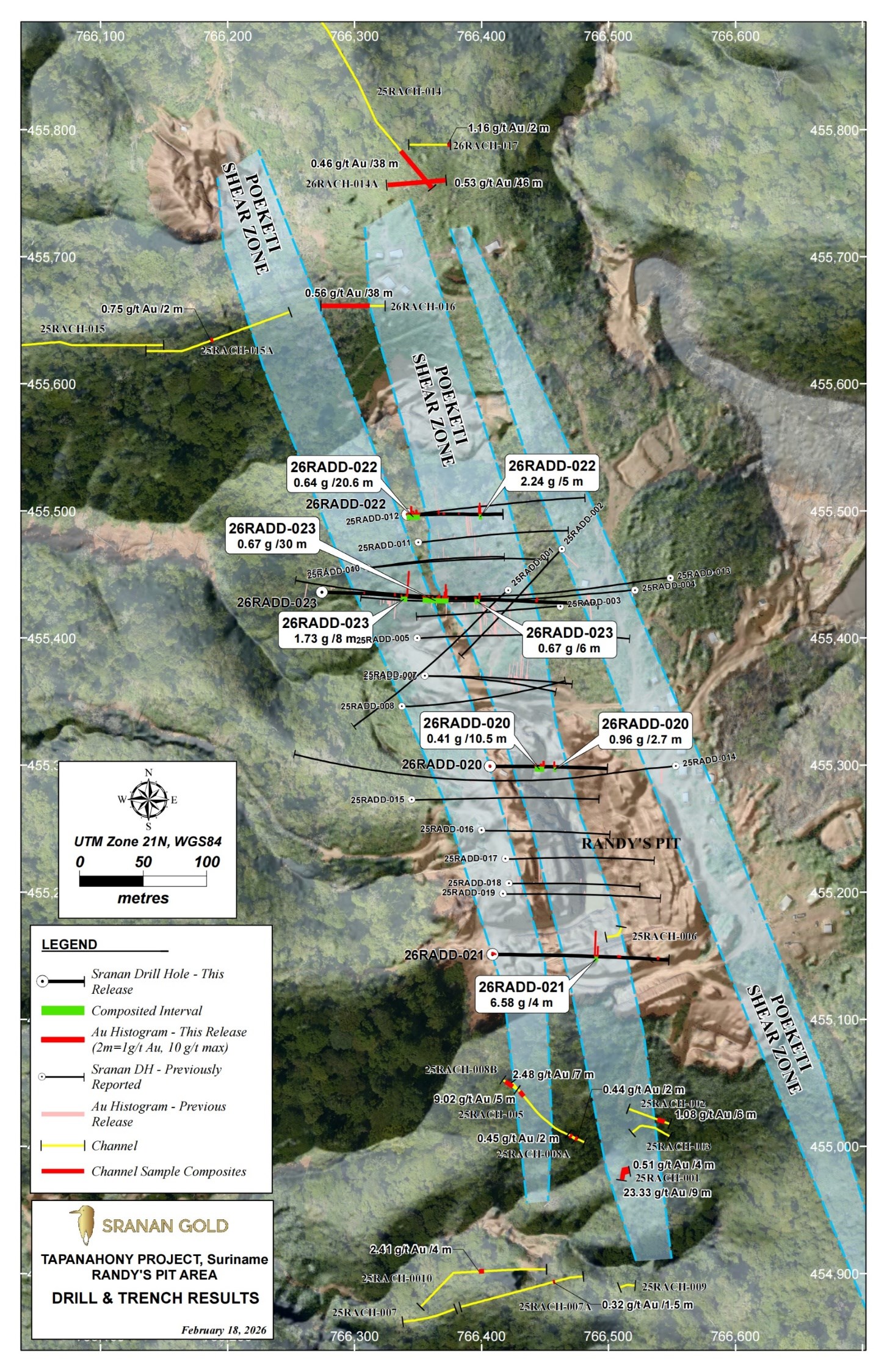Sranan Gold Corp. (CSE: SRAN,OTC:SRANF) (OTCQB: SRANF) (FSE: P84) (Tradegate: P84) ("Sranan" or the "Company") announces assay results from its ongoing 2026 diamond drilling program currently focused on the Randy's Pit target. These results continue to extend Randy's Pit gold mineralization with significant near-surface assay results returned (Table 1). Randy's Pit lies along the +4.5-kilometre Poeketi Shear Zone ("PSZ") which represents one shear zone on Sranan's 29,000-hectare Tapanahony Gold Project.