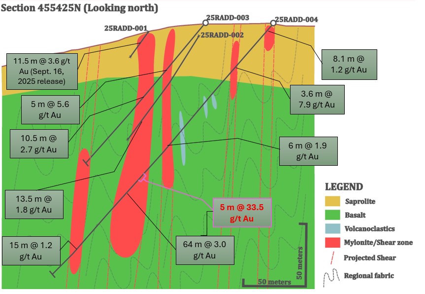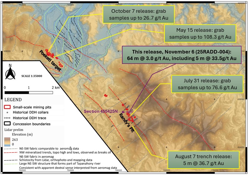 Dr. Dennis LaPoint, EVP of Exploration and Corporate Development, commented: "These impressive intercepts are the result of careful geologic and logging observations by Sranan Gold and are the first holes in the evaluation of this significant gold system. The results of hole 25RADD-004 are truly impressive. We will continue to delineate the deformation history and geometry of this major structurally-controlled gold system as we extend drilling along strike and at depth. Drilling has not yet tested below the Randy's Pit nor the extensions seen in trenching."