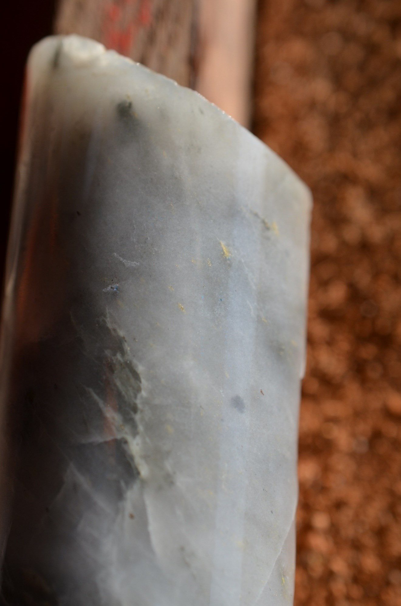 Figure 3: Visible gold, 1-2 mm fine free gold within shear planes, from 167 m to 168 m in hole 25RADD-004, grading 145.4 g/t Au.