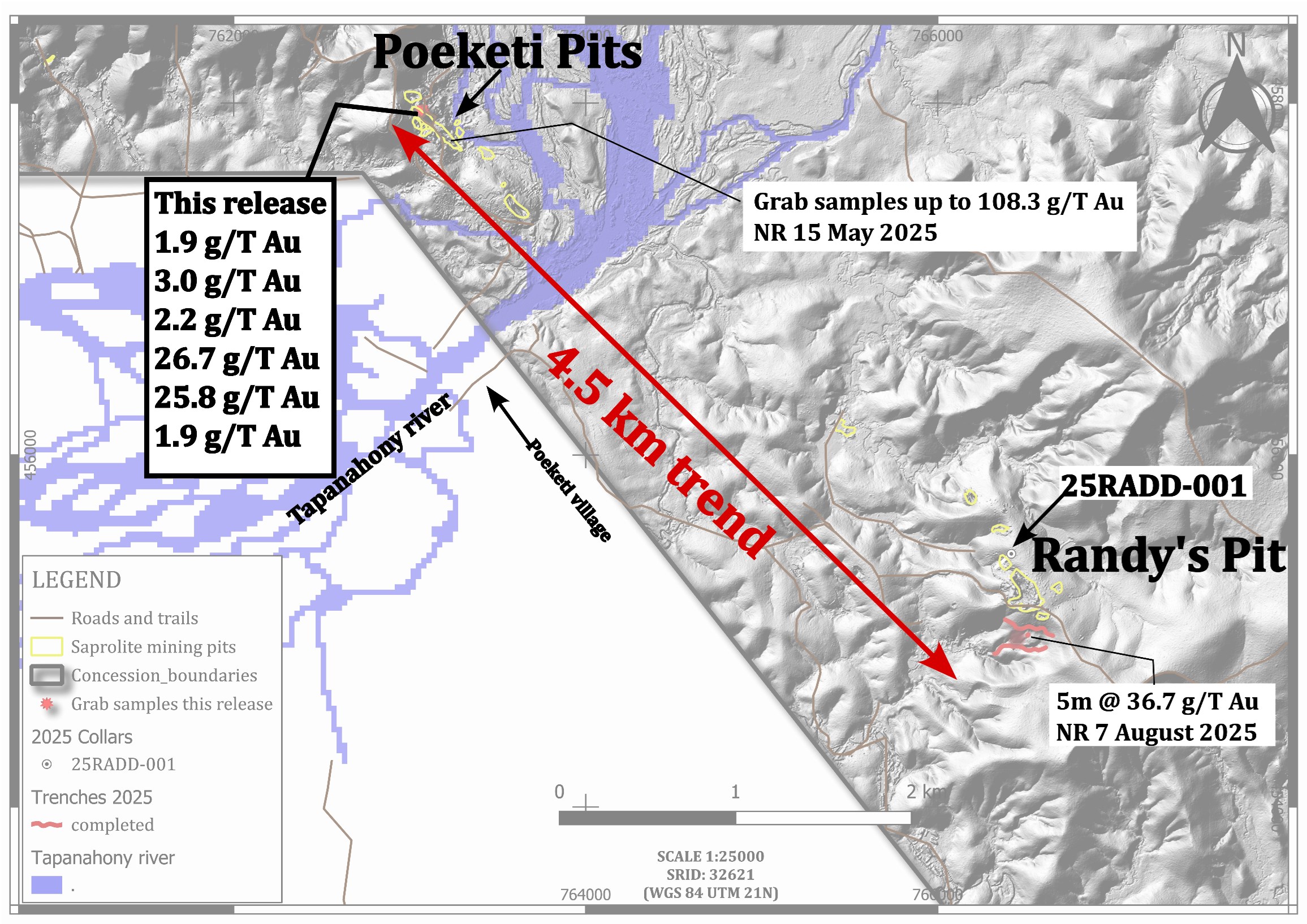 Dr. Dennis LaPoint, EVP of Exploration and Corporate Development, commented: "Having access to the small-scale underground mining is a significant advantage for our exploration efforts. These most recent grab samples extend the Poeketi target to over 1,000 metres, to be tested by trenching and drilling. Furthermore, drill hole 25RADD-001, with 11.5 metres grading 3.64 g/t gold in saprolite (see Sranan's new release dated September 16, 2025) and trench results (see Sranan's news releases dated September 9, 2025 and August 7, 2025) from within the Randy's Pit target area defined over 500 metres to be tested with further trenching and drilling. We believe the Poeketi and Randy's Pit targets are part of a larger, more robust gold system."