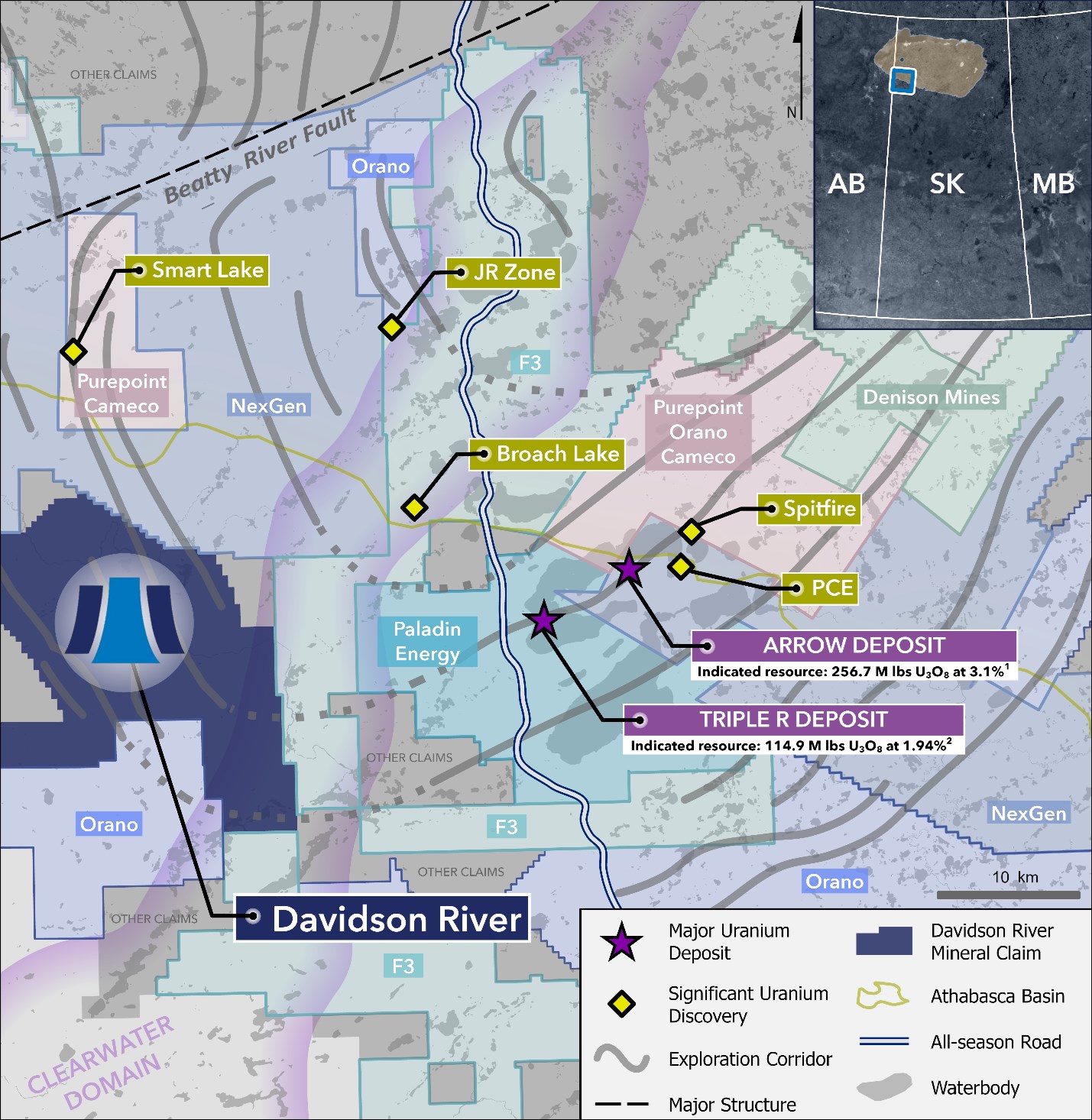 Davidson River covers 30,737 hectares of prime exploration real estate in the Southwest Athabasca Uranium District, highly prospective for basement-hosted uranium deposits along trend from high-grade* uranium deposits under development (Figure 1).