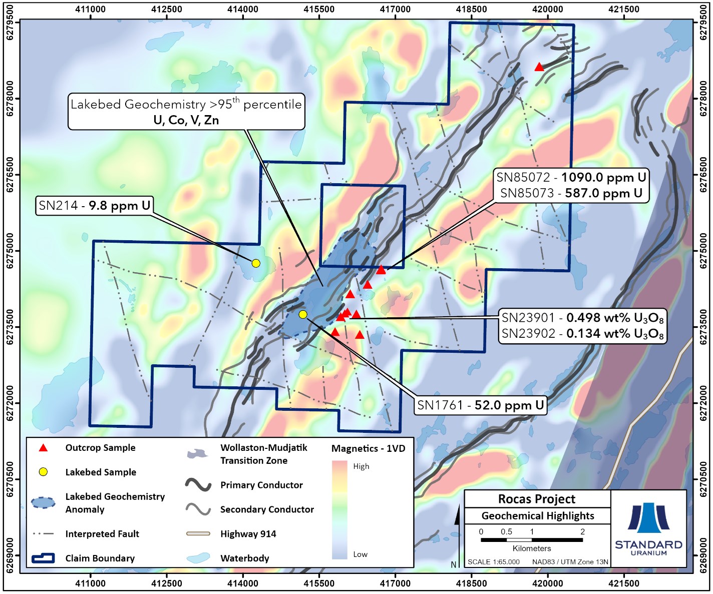 In September of 2025, Standard Uranium completed a detailed prospecting and mapping program on the Project. Historical mineralized outcrop grab samples along approximately 900 metres of strike length, returned values ranging from 587 ppm U (SN85073) up to 0.498 wt.% U3O8 (SN23901) and have never been drill tested2. Preliminary results of the prospecting and mapping program identified anomalous radioactivity up to 33,000 cps, as well as 10 separate measurements of greater than 10,000 cps3. Geochemical assay results are pending.