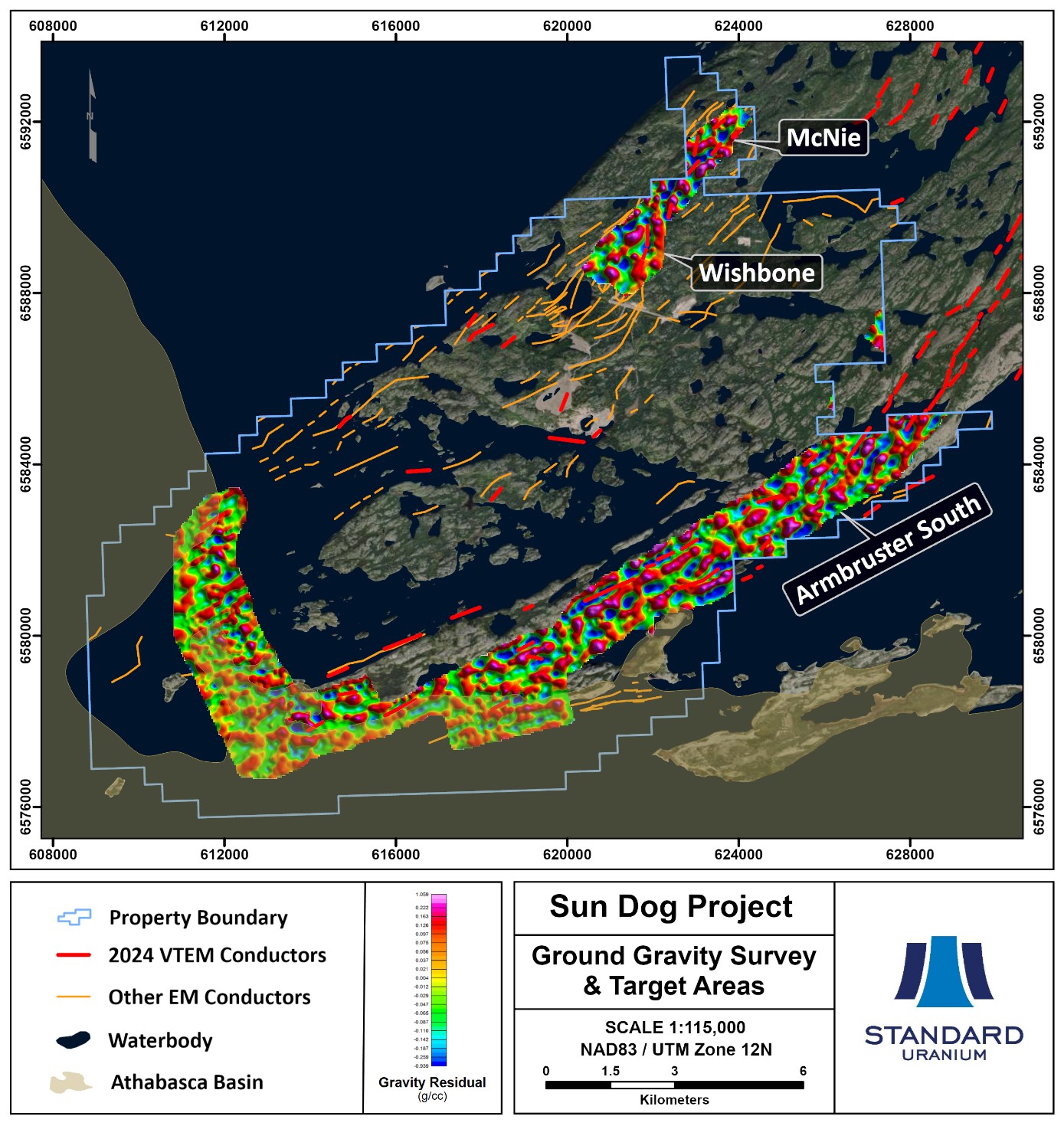 In 2025, MWH Geo-Surveys Ltd. completed high-resolution ground gravity surveys along known conductive exploration trends across the Wishbone, McNie, and Armbruster South target areas, filling in the gaps between the previous 2022 gravity grids (Figure 2). These surveys have identified numerous density-low bullseye anomalies representing potential zones of hydrothermal alteration or structural disruption which are commonly associated with uranium mineralization events.