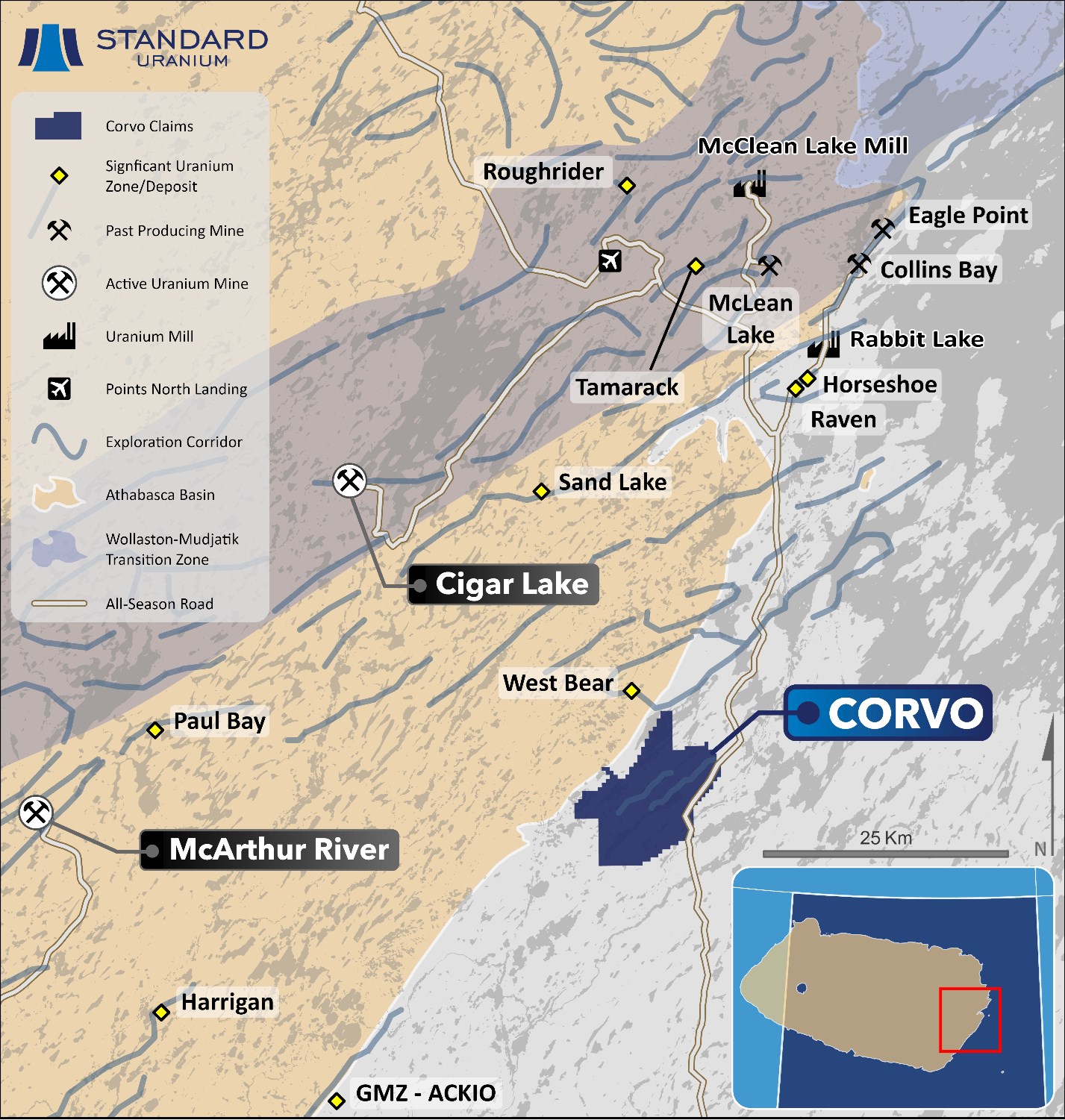 "Getting the drills turning at Corvo is a major milestone for Standard and our partners at Aventis Energy, notably as we will test the high-grade Manhattan Showing at depth," said Sean Hillacre, President & VP Exploration. "By combining the surface mineralization of 8.10% with our newly defined gravity lows and EM conductors, we have clear, high-priority targets that fit the classic signature of unconformity-related uranium deposits. With the support of our partners at Aventis, our team is eager to see what this northwestern corridor holds as we apply a rigorous, discovery-focused approach to this inaugural program."