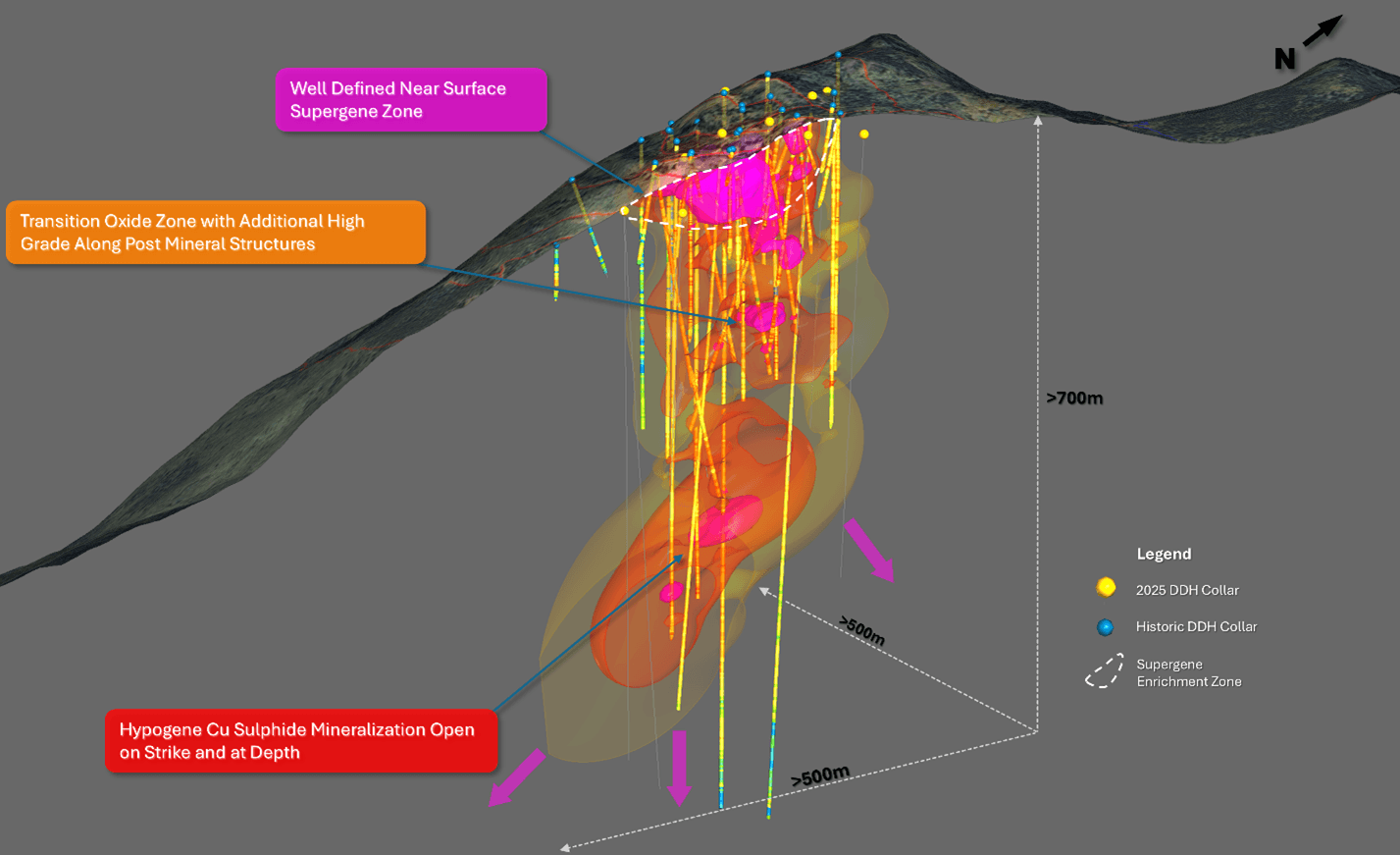Mr. Jones continues, "The model highlights the vertical continuity of mineralization from surface through the oxide and transition zones into deeper sulphide domains, reinforcing the interpretation of a robust porphyry copper system. Importantly, deeper sulphide mineralization remains open, with limited drilling having tested the full vertical extent of the system."