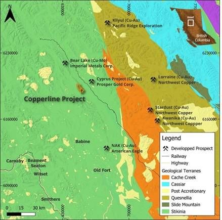 The Copperline Property comprises 6 mineral tenures totalling 945 hectares in the Omineca Mining Division of British Columbia. The property is located at Latitude 55°50'N, Longitude 126°36'W (NTS 93M/15E), approximately 120 km north-northeast of Smithers. Access is by helicopter from Smithers or via logging roads extending from the Nilkitkwa River area.