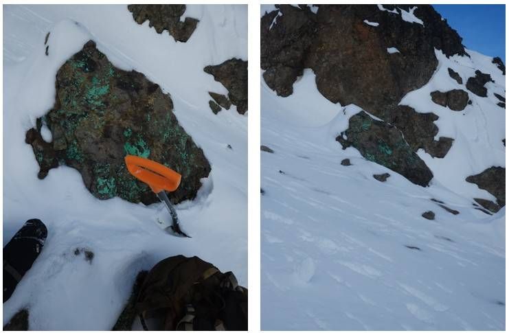 While attempting to access historic trenches (obscured by snow), the field crew observed large boulders with visible malachite on slopes below the historic Main Zone. Two grab samples were collected. These boulders are interpreted as talus likely derived from the Main Zone mineralization upslope, providing additional confirmation of copper mineralization in the area.