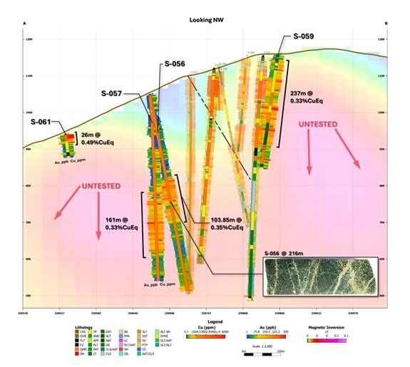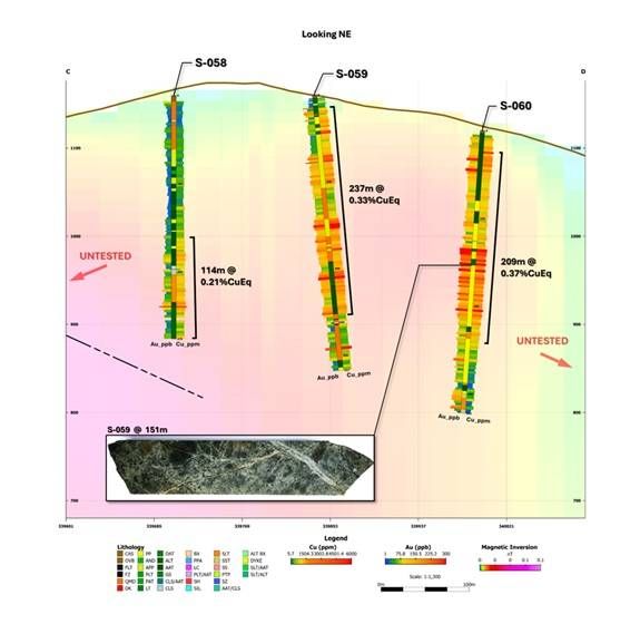 Hole S-059 intersected 313m of 0.281% CuEq (0.217% Cu and 0.063 g/t Au) from 3.35m