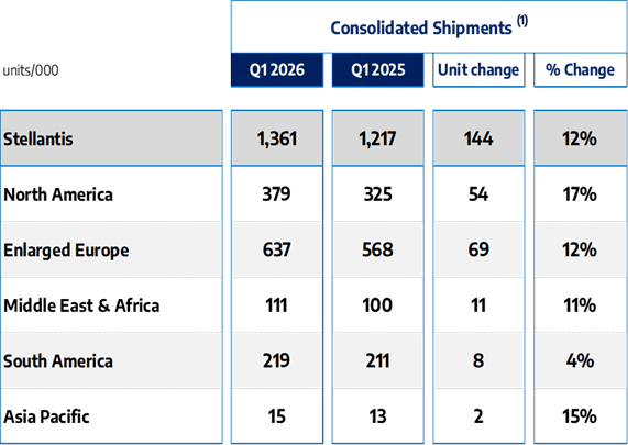 - In Enlarged Europe, Q1 shipments increased by approximately 69 thousand units, up 12% y-o-y. LCV volumes were stable at approximately 135 thousand units. Passenger car volume growth was driven by new launches. FIAT, Opel/Vauxhall and Citroën brands shipments benefited from the performance of Smart Car platform nameplates (Citroën C3, C3 Aircross, Opel/Vauxhall Frontera, Fiat Grande Panda) which increased by approximately 48 thousand units, or 85% y-o-y. Leapmotor-branded vehicles gained commercial momentum, with shipments increasing by 22 thousand units to approximately 27 thousand units; supported by the success of the T03, in the BEV entry-price segment across Europe, particularly in Italy.