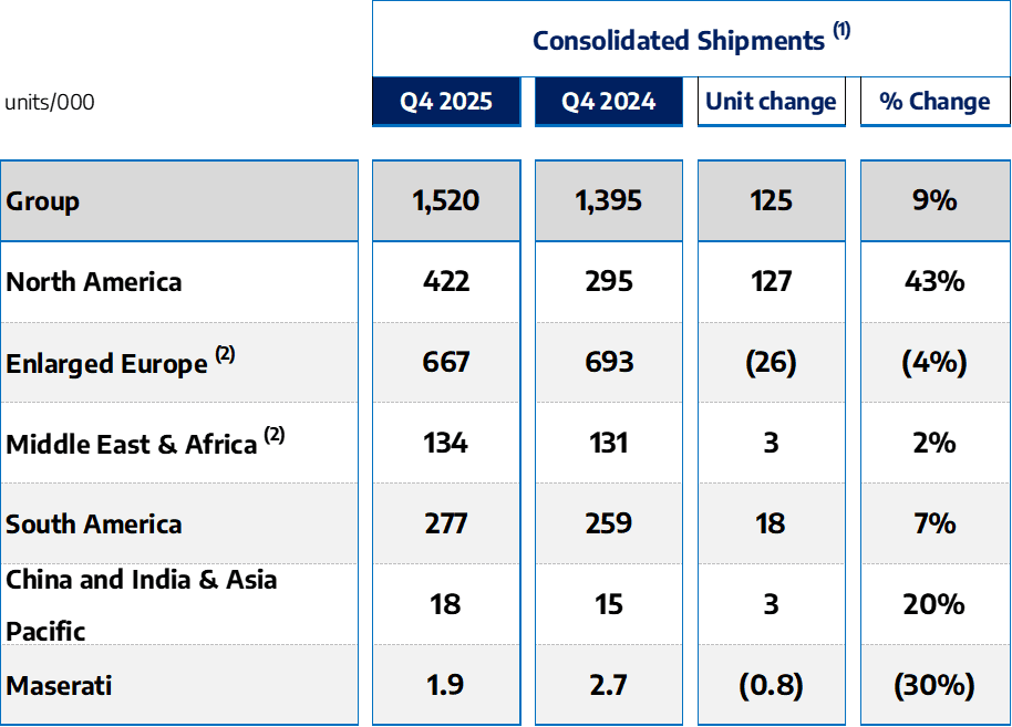 - In North America, Q4 shipments grew by approximately 127 thousand units compared to the same period in 2024, representing a 43% y-o-y increase. This significant improvement reflects the benefits of normalized inventory dynamics, in comparison to the prior year's inventory reduction initiative, as well as increased momentum in the region with Q4 '25 orders up nearly 150% y-o-y, driven largely by new and refreshed offerings from Jeep®, Ram and Dodge brands. Shipments of the refreshed Jeep® Grand Cherokee and Ram LD HEMI® V8 accounted for over 30% of y-o-y growth, partially offset by a decrease in PHEV shipments.