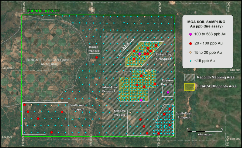 These seven gold prospects include the previously reported Fifty-Five, Central and South-East Prospects, together with newly identified Eastern, Rouge, Konezra and South-West Prospects, all characterised by one or more +30 ppb Au soil anomalies derived from systematic geochemical soil sampling.