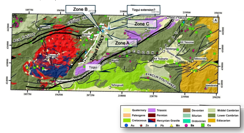 On a regional scale Zone B represented a significant structural intersection, between the Tizgui and Arg-Erdouz faults which created a Y-shaped trap that focussed gold-bearing hydrothermal fluids. This setting, linked to deep structures around the Tichka granite, generated intense fracturing and the deposition of high-grade gold veins in favourable carbonate and diorite hosts. In essence, Structure B exhibited as an exceptional structural trap site for gold mineralisation.