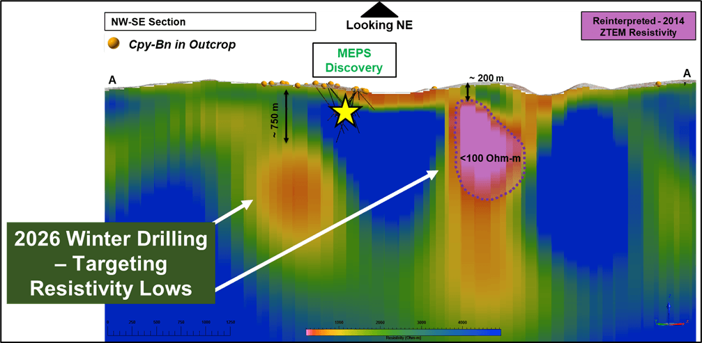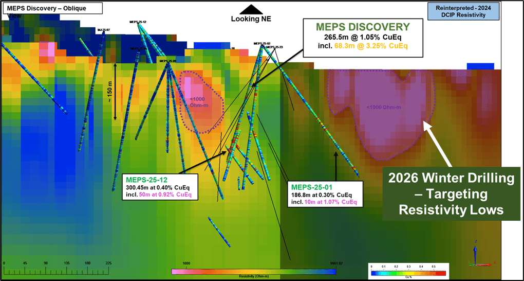 The 2026 drill program will focus on systematically delineating the scale of the MEPS Discovery area and evaluating additional targets generated from surface copper occurrences and geophysical data. Recent drilling has demonstrated a strong correlation between resistivity lows, favourable structural trends and copper mineralization which has been reinforced through physical property testing in drill core. The relative scale of the resistivity low associated with the MEPS Discovery and the resistivity lows associated with 2026 targets shows potential for a much larger system than what was delineated in 2025.