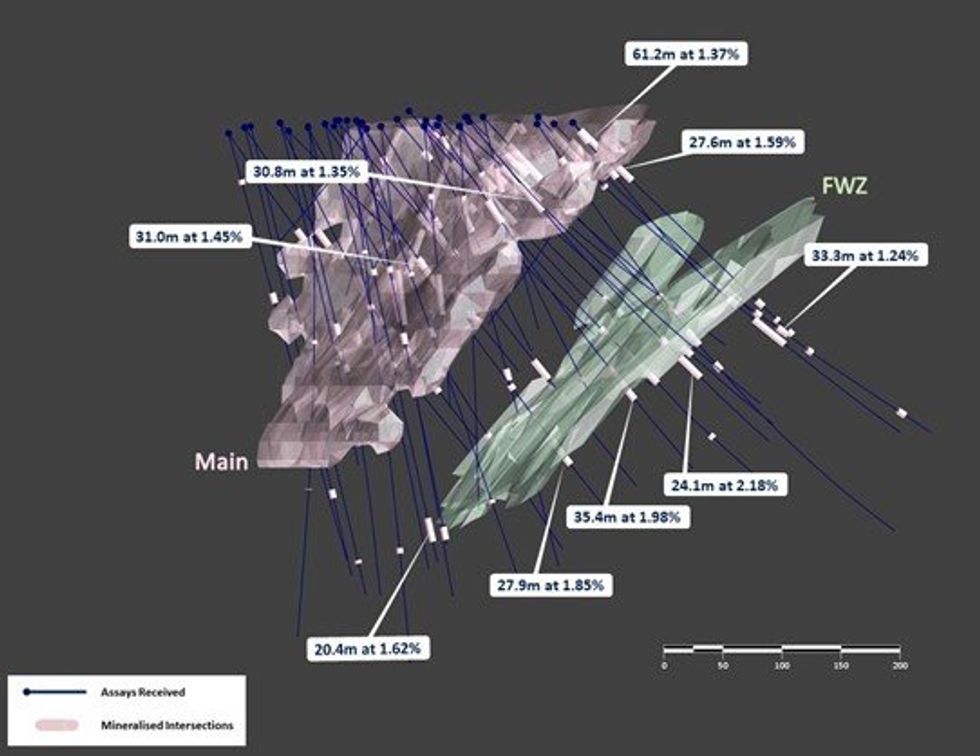 All drillholes tested both the Main Zone and the recently discovered Footwall Zone, with thick, high-grade intersections received from both zones as detailed in Tables 1 and 2 above. New results received are shown on Figures 1 and 2 with all data from the programme to date included in the Appendices. A total of 76 holes had been completed for 22,500 metres at the time drilling was suspended. Assays have now been received for 62 of these drillholes.