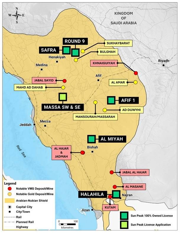 Sun Peak now holds 1,072 km² across 13 exploration licenses in Saudi Arabia which have been carefully selected and cover highly prospective ground along established VMS and gold trends, with a further ~200 km² under application (Figures 1 and 2).
