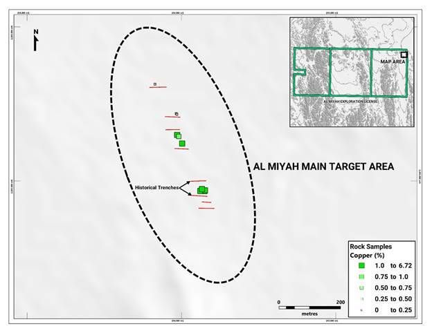Samples from Al Miyah Main returned assays up to 4.53 g/t Au, 3.72% Cu, and 42.2 g/t Ag.