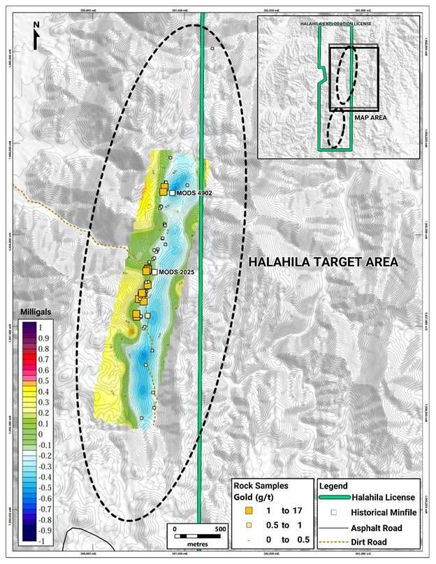 Figure 7. Halahila target with contoured gravity and geochemistry results for gold