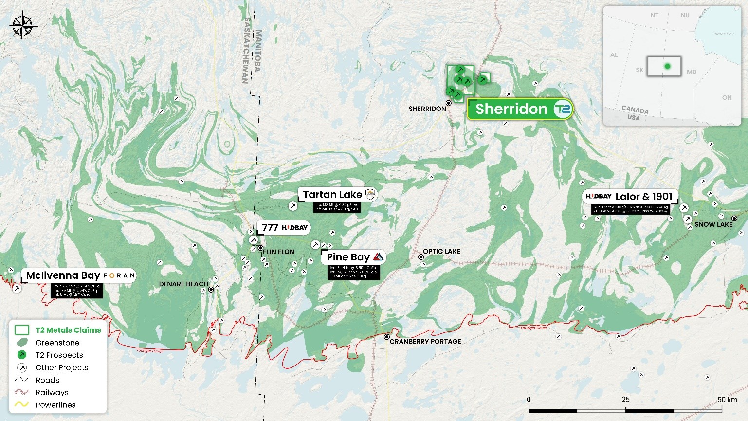 Mark Saxon, President and CEO of T2 Metals, commented, "This new mineral resource estimate for Sherridon is a key step forward for the project and the Company. The attention on the future supply/demand for copper continues to grow, buoyed by rapid growth in energy, transport and data storage demands. Analysts have identified copper as a premier investment opportunity for 2026, and the value of established, near-surface deposits in a stable jurisdiction like Manitoba cannot be overstated. Metal prices used in the 2010 resource estimation were US$900/oz gold, US$15.00/oz silver, US$2.50/lb copper and US$1.00/lb zinc with current prices providing an opportunity for significant resource growth.