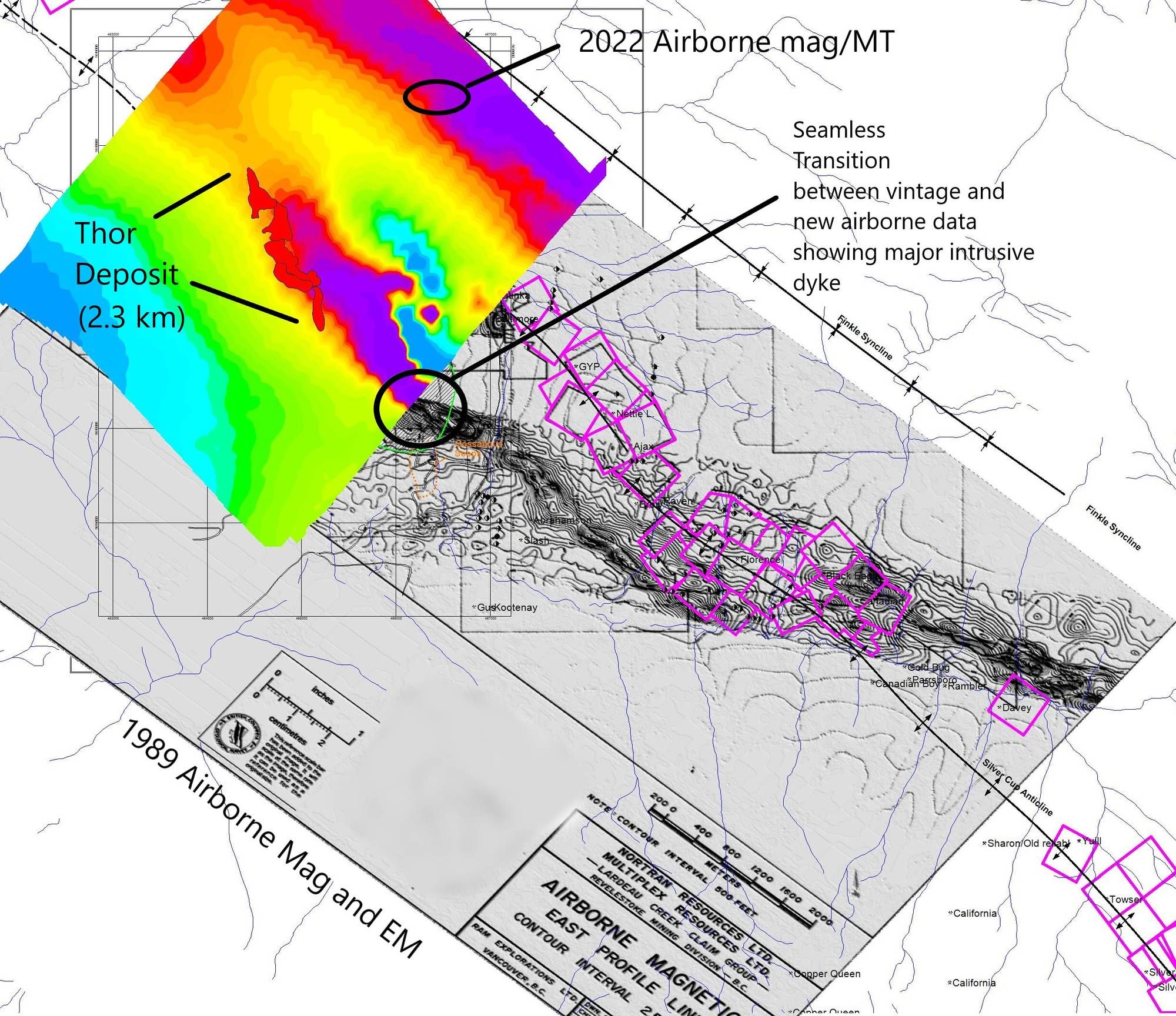 Taranis' land package now exceeds 6,000 contiguous hectares, encompassing numerous historic silver mines that saw limited exploration over the past 130 years. Taranis' integrated approach is providing new clarity on the structural, stratigraphic and intrusive controls that link the historic mines to the Thor deposit. A particularly noteworthy success is the integration of a 1989 airborne magnetic survey (commissioned by Nortran and Multiplex Resources) with Taranis' own airborne magnetotelluric survey conducted in 2022. Taranis has been able to join both surveys for a combined length of 14 km covering Taranis entire land package.
