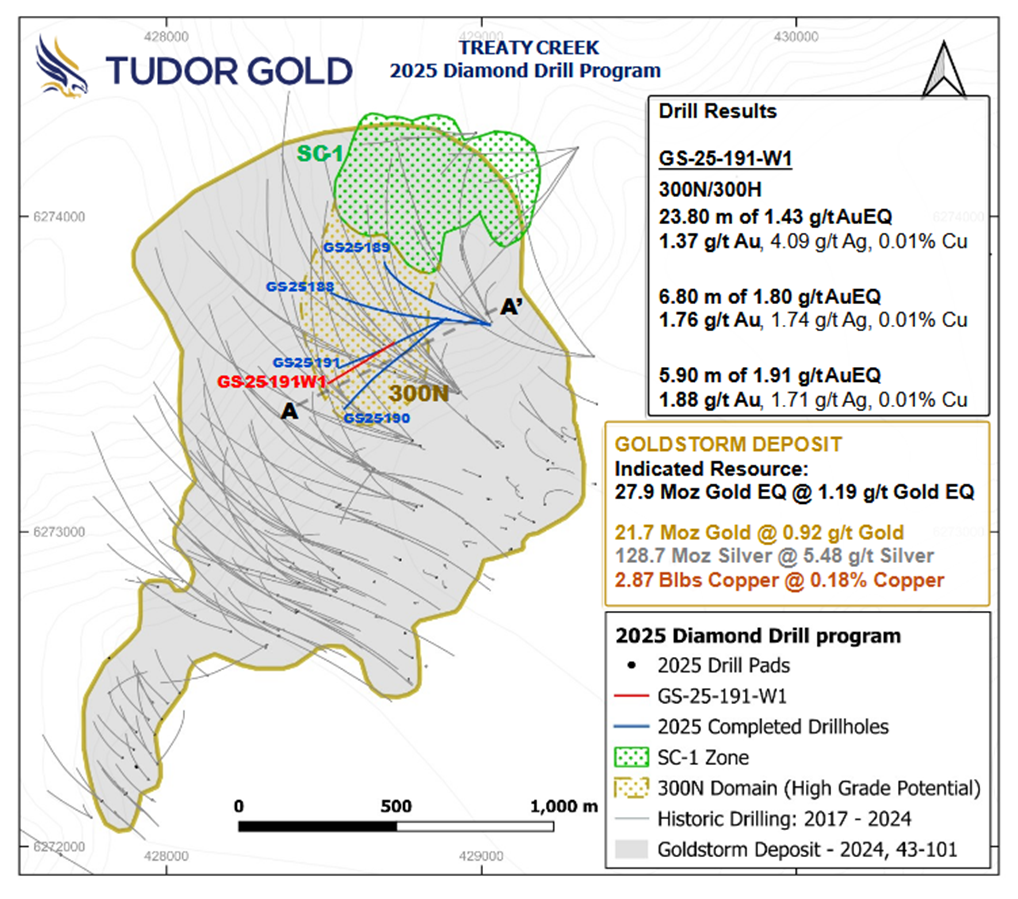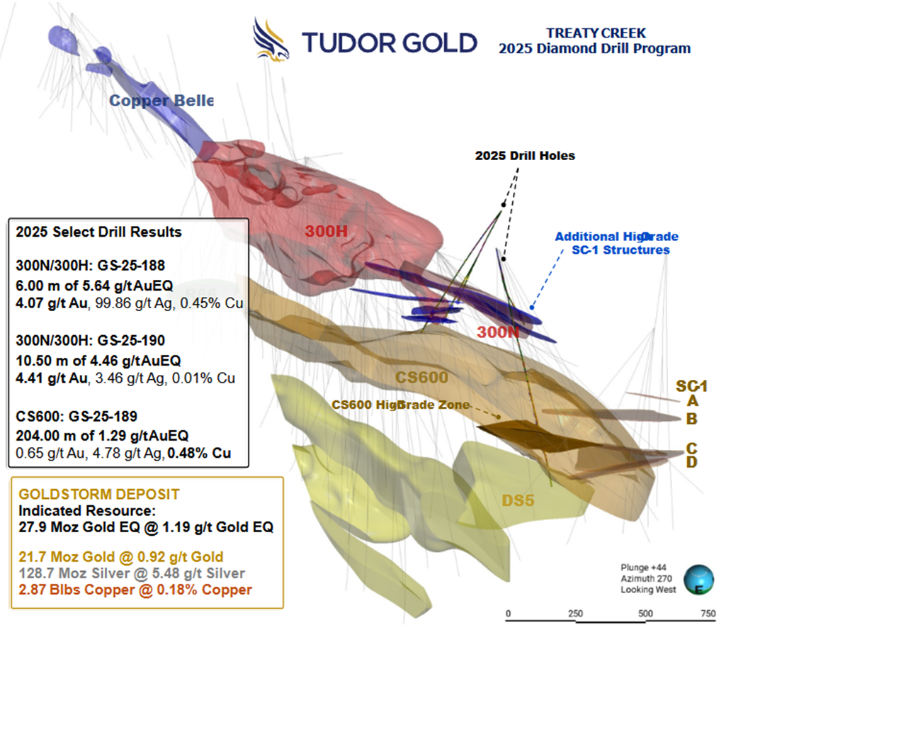 The 2025 Treaty Creek Exploration Program was designed to target gaps between the 300N and 300H Zones, as well as the recently discovered high-grade SC-1 Zone. The potential for additional high-grade SC-1 Zone-like structures was also targeted, with results confirming and expanding several high-grade corridors within and surrounding the 300N and 300H Zones.
