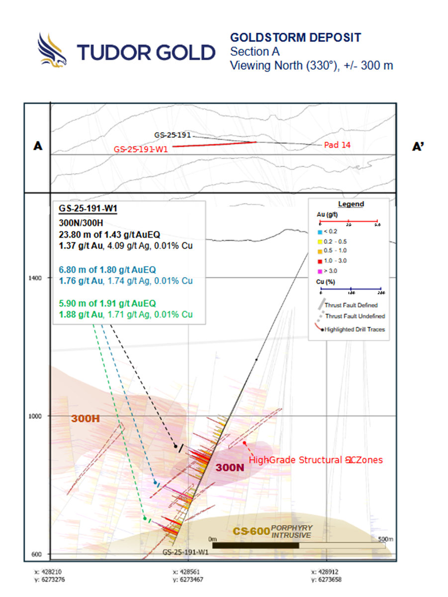 GS-25-191-W1 was targeted to demonstrate continuity between high-grade mineralization on a North-South axis between drillholes GS-25-190 and GS-25-191, as well as a Southwest-Northeast axis connecting the 300H and 300N mineralized domains. This drill hole further confirms a high grade intercept observed in GS-25-191 (4.12 g/t gold, 16.48 g/t silver, and 0.01% copper (4.30 g/t AuEQ) over 8.90m), stepping out 52m to the south intercepting 1.63 g/t gold, 4.89 g/t silver, and 0.02% copper (1.70 g/t AuEQ) over 10.70m. Additionally, a separate high-grade SC-1 like structure was intercepted lower in the hole, stepping out 75m to the north of several drillholes from 2022, providing continuity between 300H and 300N mineralized domains intercepting 1.88 g/t gold, 1.71 g/t silver, and 0.01% copper (1.91 g/t AuEQ) over 5.90m. Furthermore, a third unexpected intercept of 1.76 g/t gold, 1.74 g/t silver and 0.01% copper (1.80 g.t AuEQ) over 6.8m provides continuity to a previously unidentified additional SC-1 structure.