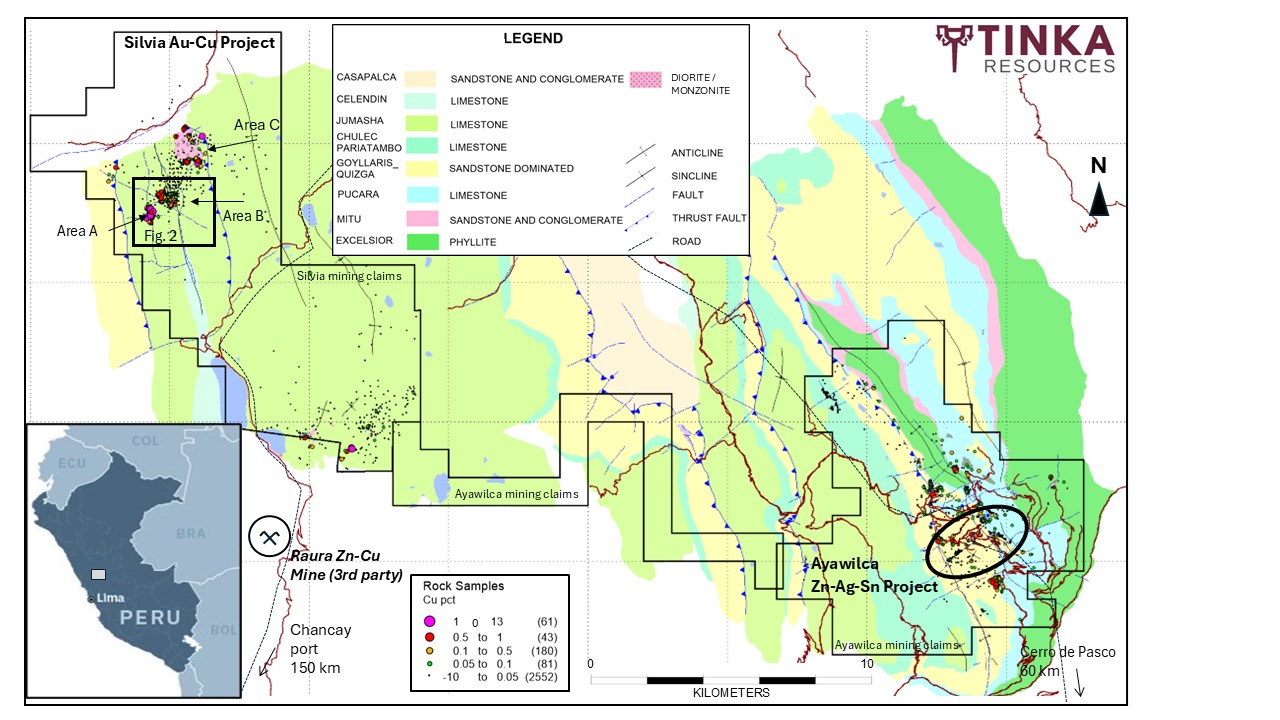Figure 1. Regional geology map of Tinka's Silvia and Ayawilca projects with copper surface sampling and tenements